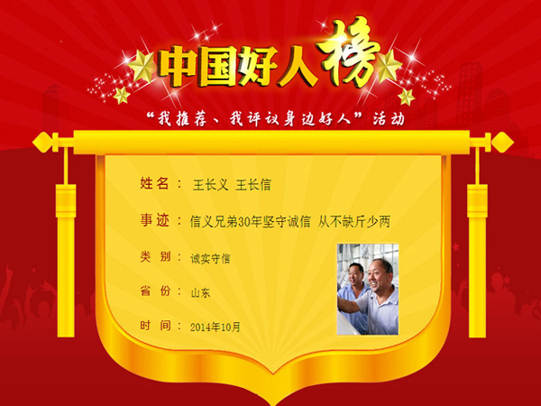 泰安市金麥香面粉有限公司是一家私營(yíng)企業(yè),掌舵人王長(zhǎng)義和總經(jīng)理王長(zhǎng)信兄弟倆人被人們稱(chēng)為信義兄弟,在信義兄弟的堅(jiān)強(qiáng)領(lǐng)導(dǎo)下,在各級(jí)政府的大力支持下,在企業(yè)員工的拼搏下,在客戶(hù)的呵護(hù)下,今天的金麥香欣欣向榮,蒸蒸日上。信義兄弟先后榮獲“泰安市勞動(dòng)模范”、“山東好人”、“山東省道德模范”、“全國(guó)道德模范提名獎(jiǎng)”、“全國(guó)文明家庭”、“全國(guó)十大誠(chéng)信之星”、“全國(guó)優(yōu) 秀農(nóng)民工”等稱(chēng)號(hào)。...